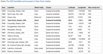 A notable exception is the landslide generated tsunami in lituya bay, alaska in 1958 which produced a 60 meter high wave.